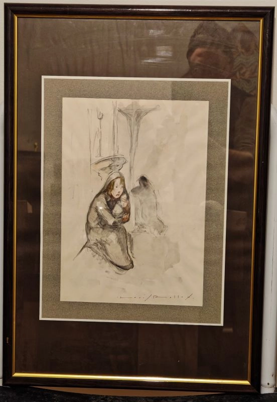 Beautiful watercolour on paper, ‘Mother and Child’, signed. In a glass and wood subframe, gold aluminium structure and parrot bevel frame.