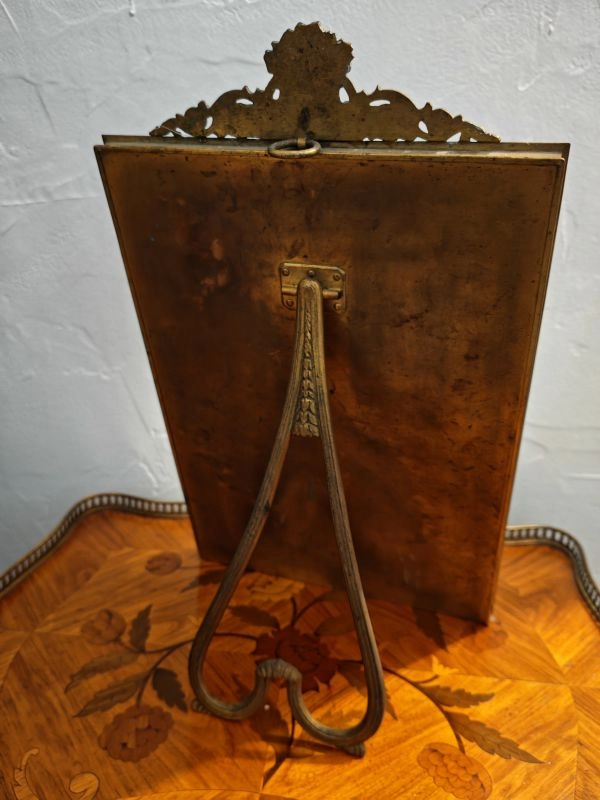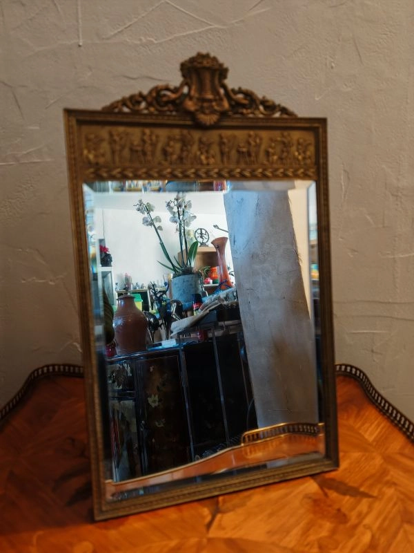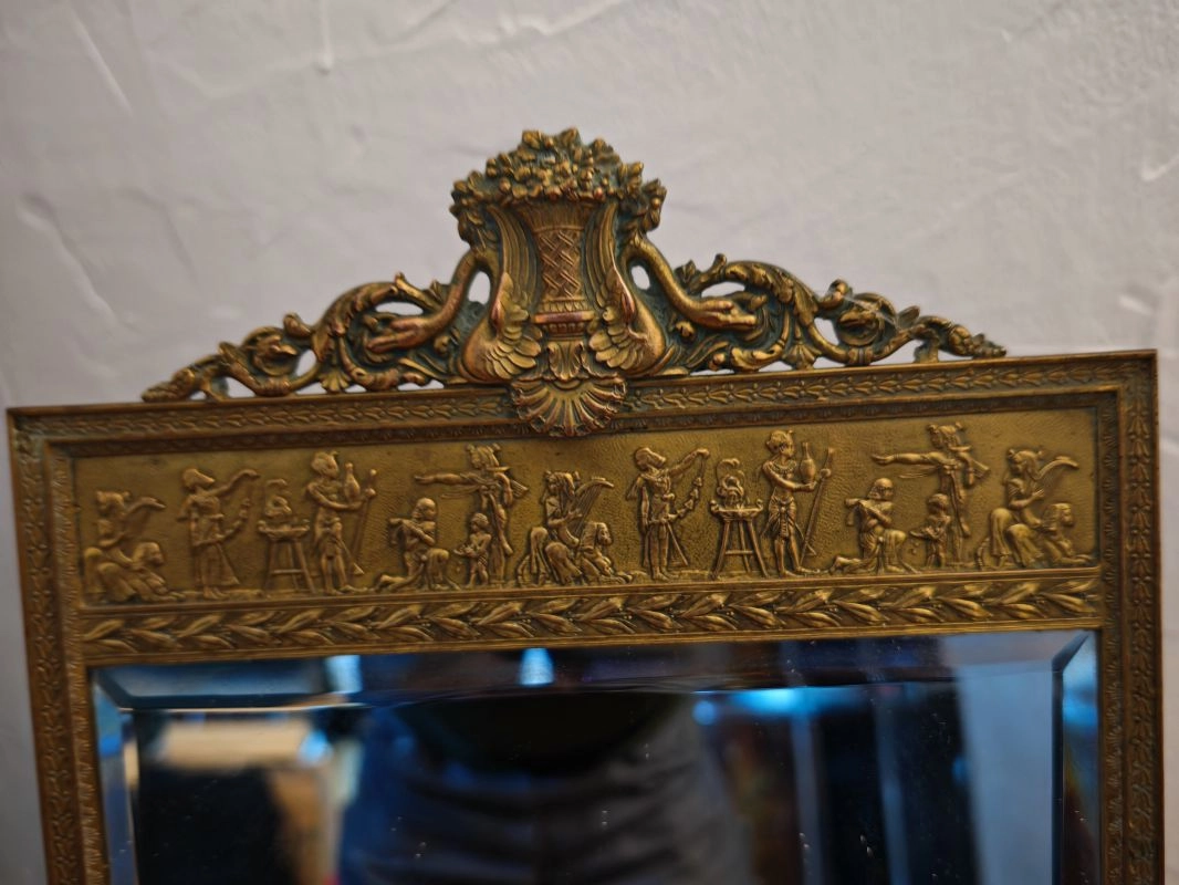 Superb richly decorated rectangular mirror in gilded bronze with bevelled glass; large frieze depicting Egyptian pharaohs. Late 19th century.