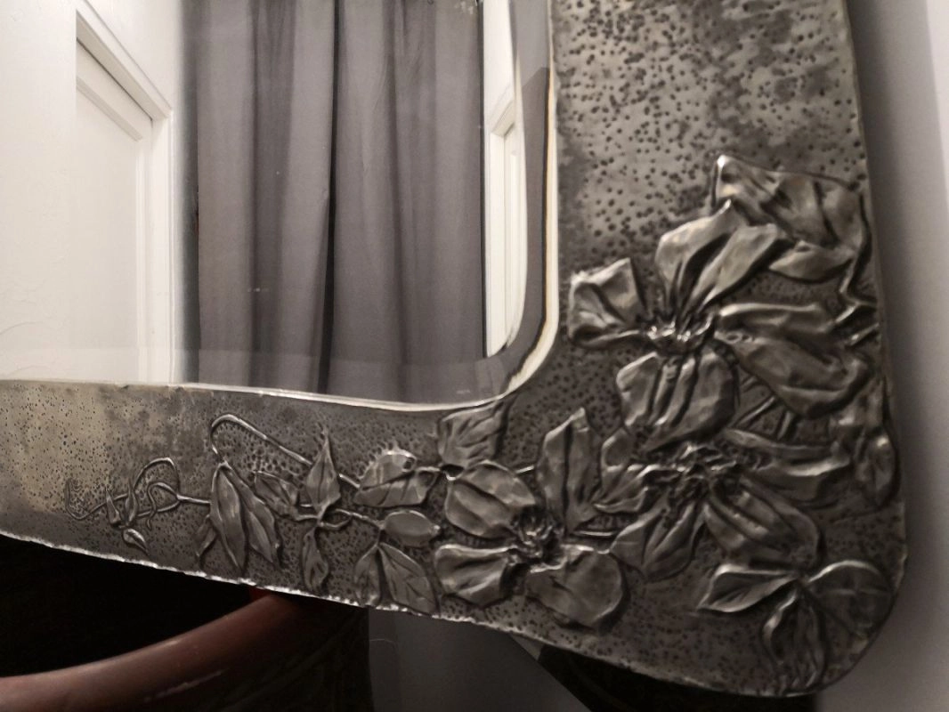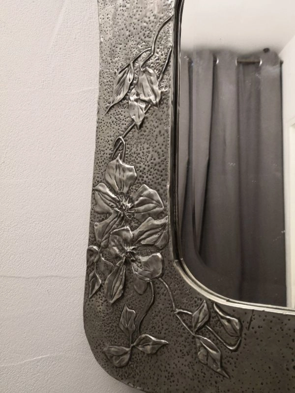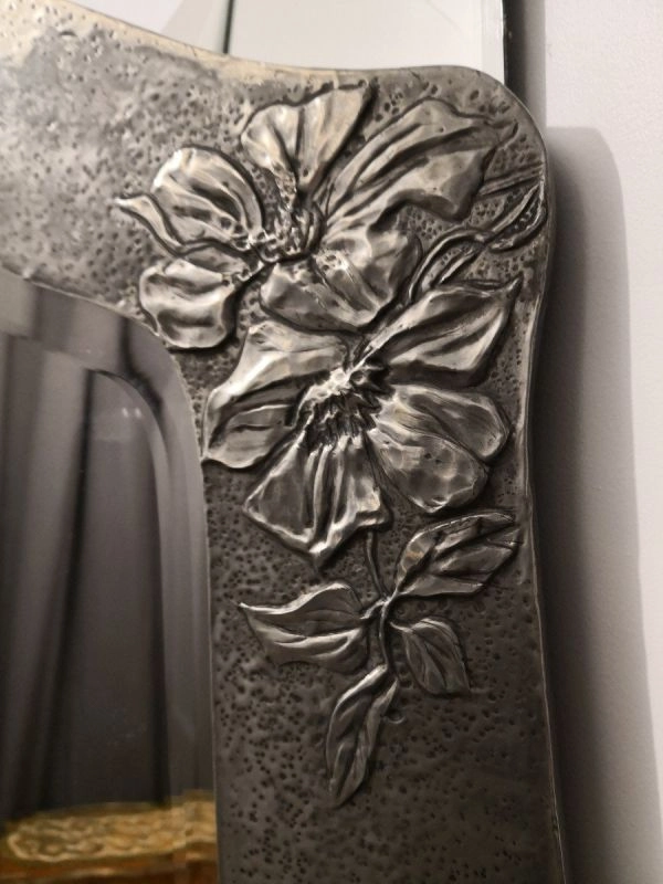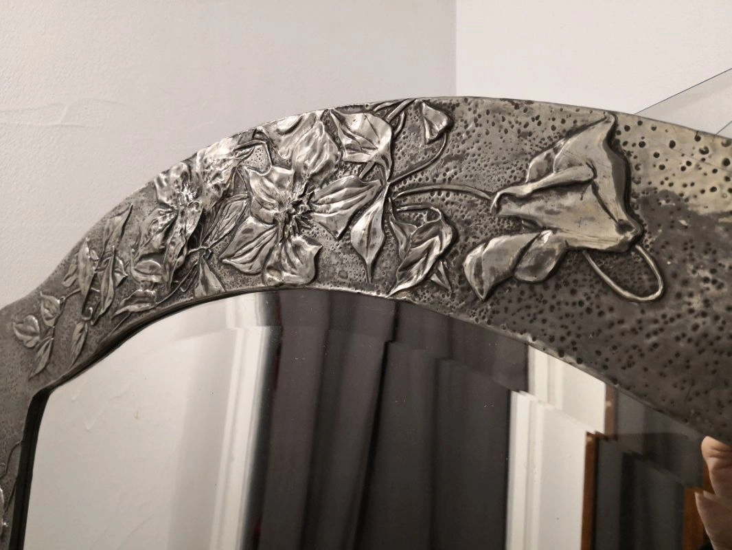 Splendid ART DECO mirror from 1900, in the shape of a gendarme's hat, made of brushed and embossed pewter.