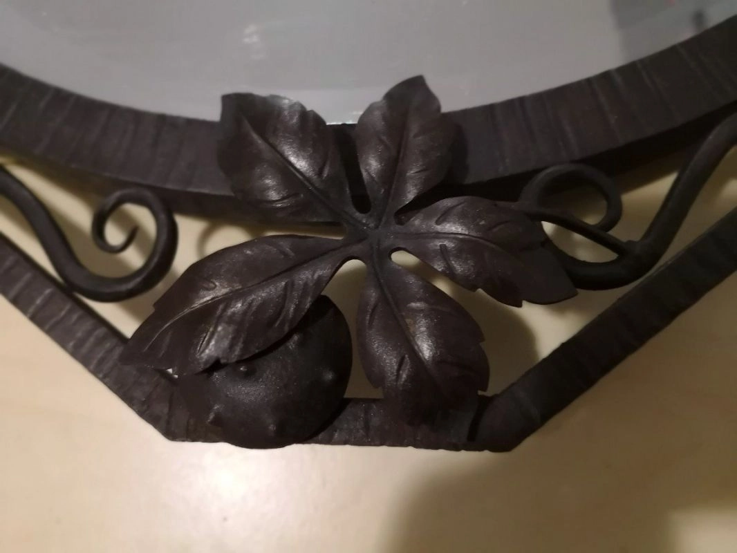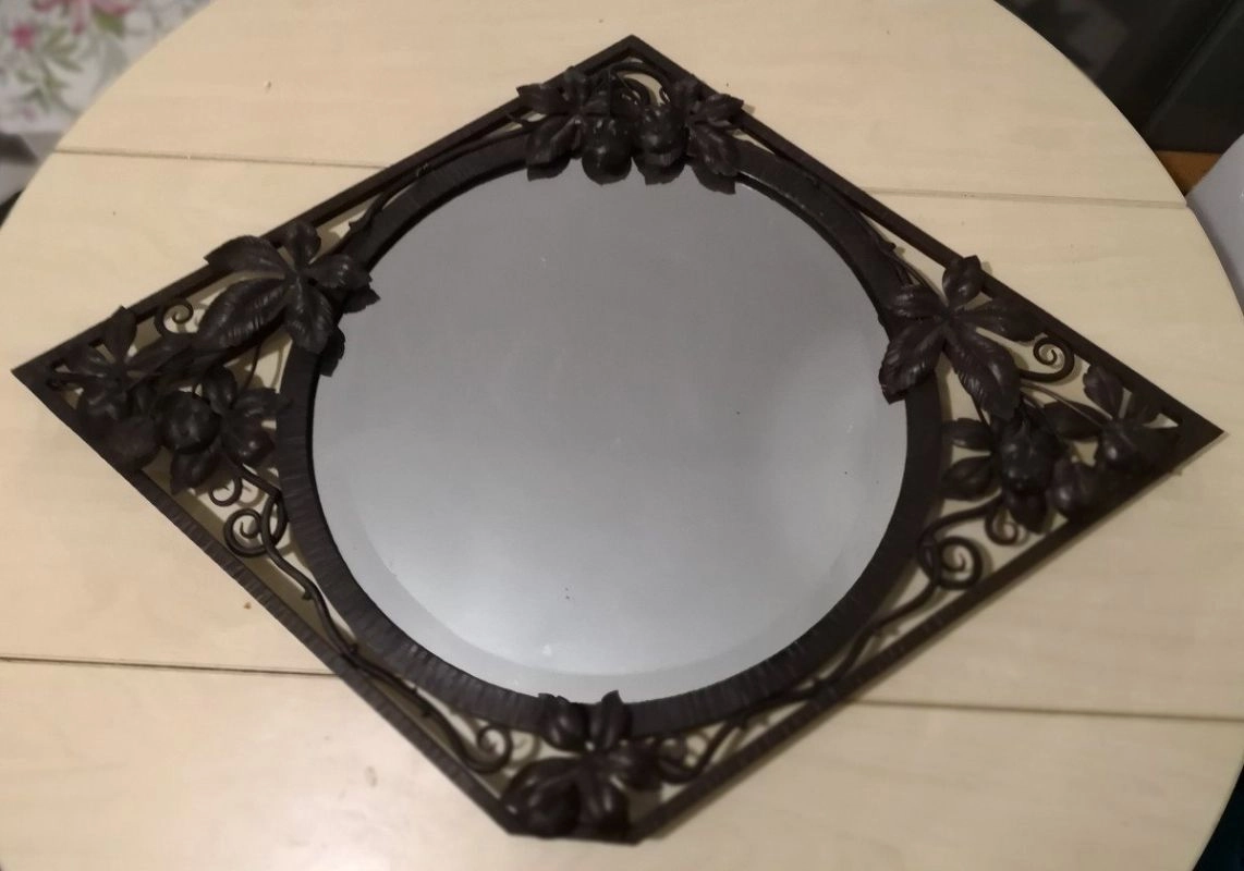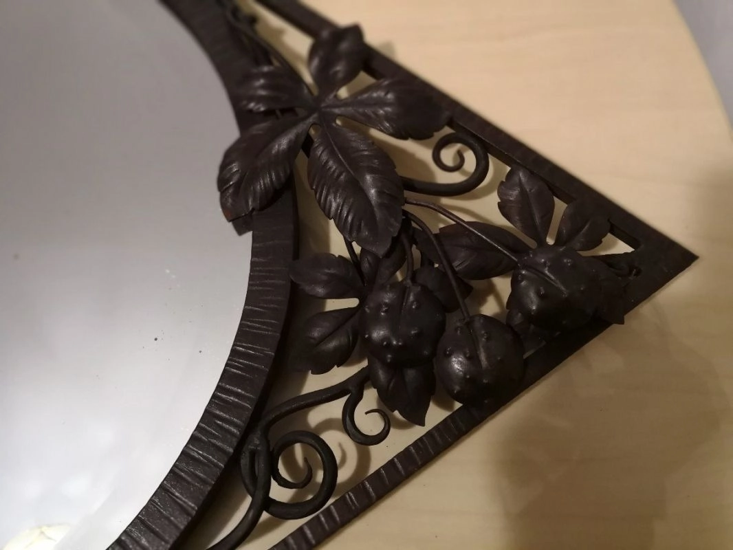 with wrought iron and metal decoration featuring chestnut branches surrounding a round, bevelled mercury glass mirror (40 cm)