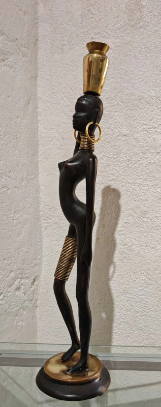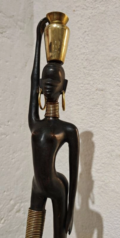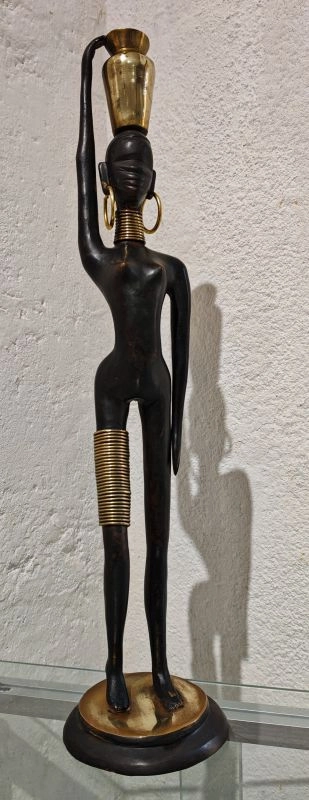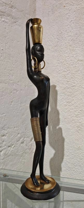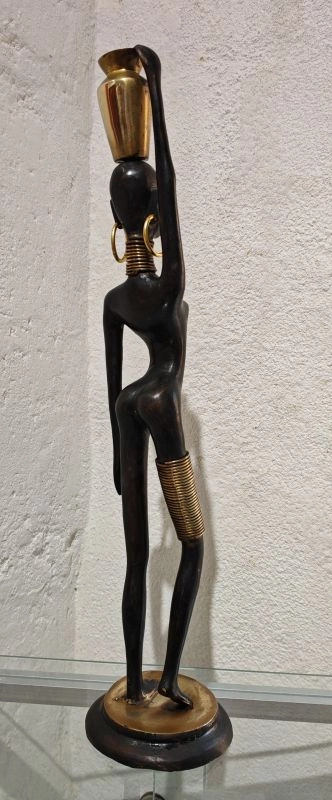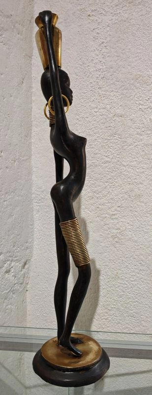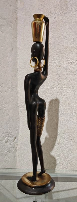 Sculpture de style ART DECO, en Bronze à double patine, Dorée et Noire représentant une Jeune Femme Girafe, avec ses rangées de collier autour de son cou et portant une amphore.