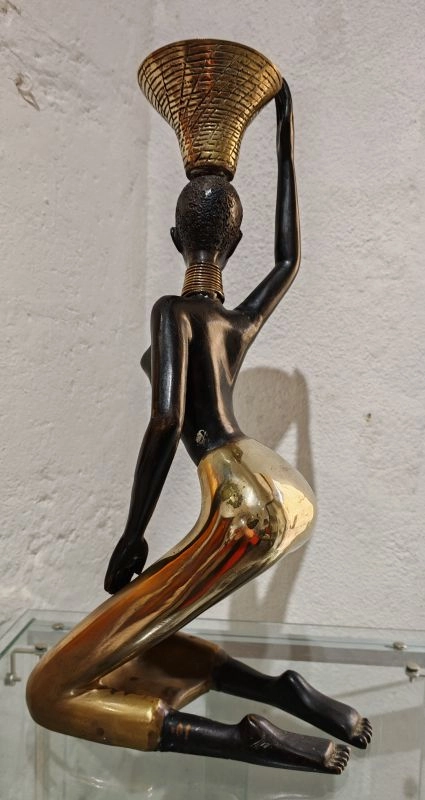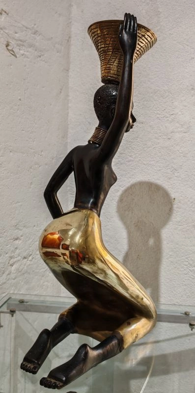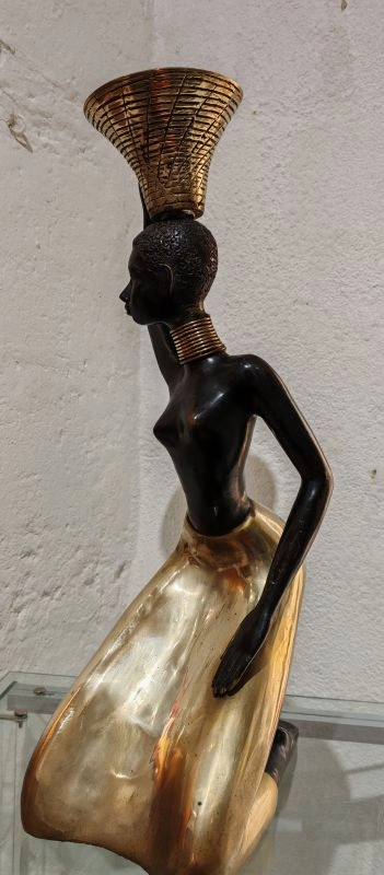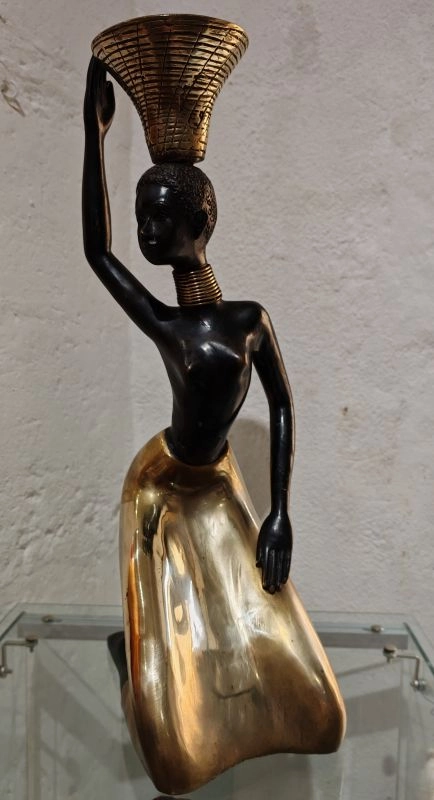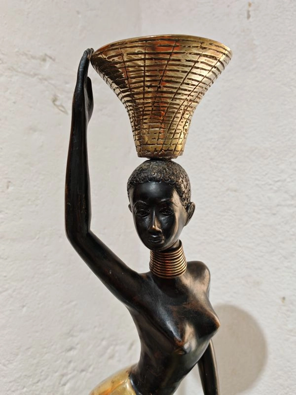 Sculpture de style ART DECO, en Bronze à double patine, Dorée et Noire représentant une Jeune Femme Girafe agenouillée, avec ses rangées de collier autour de son cou et portant un grand vase